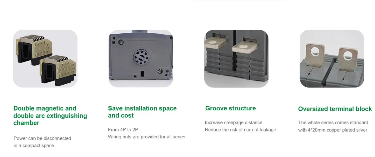 • Todos os materiais de contacto são em liga de cobre prateada e possuem duas superfícies de contacto de separação.