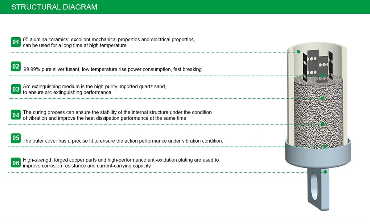 • Descrição do material: Cerâmica de alta resistência de 95% de alumina e elemento de fusível de material importado.
